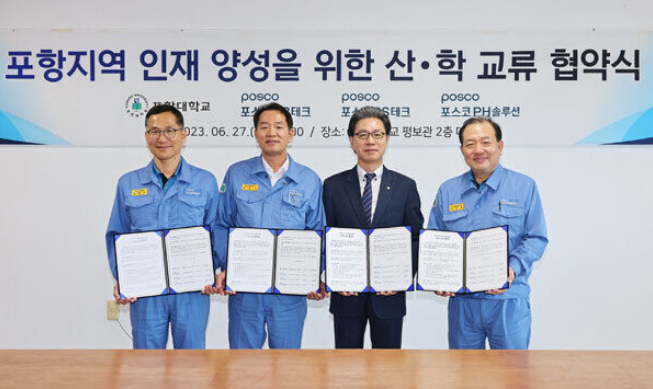포스코 정비사업회사 3사와 포항대학교가 지난 27일 지역인재 양성을 위한 업무협약을 체결한 후 기념 촬영을 하고 있다. (오른쪽부터 포스코PH솔루션 권영철 대표이사, 포항대 김형락 총장직무대행, 포스코PS테크 공윤식 대표이사, 포스코PR테크 김광수 대표이사).