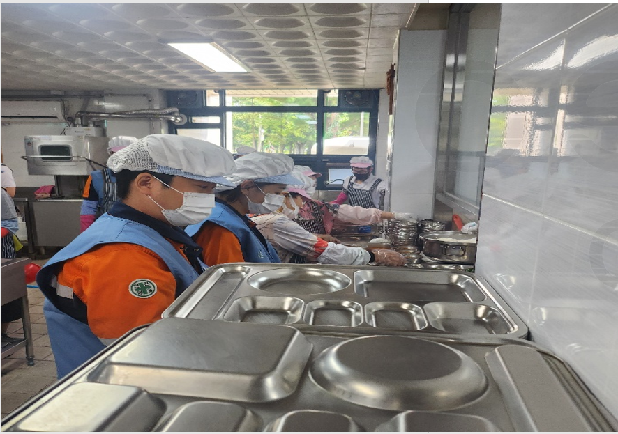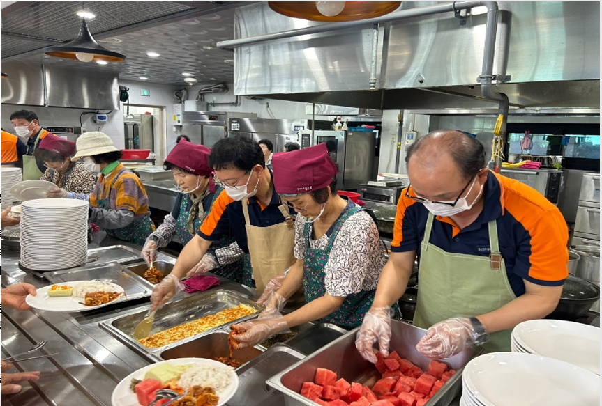 복지관 봉사활동은 매월 직원들이 방문해 식당 배식활동을 복지관 직원분들과 함께 하고 있습니다. 직원들은 주방에서 점심 급식에 필요한 음식을 준비하고 식사하러 복지관에 오신 분들께 점심 배식 활동과 식사 후 정리 정돈을 하였습니다.