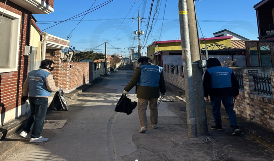 한 달 만에 재방문한 문덕5리 자매마을, 봉사활동 당일에 바람이 부는 추운 날씨였지만 많은 인원의 따뜻한 온기로 추은 날씨를 녹이며 주변 환경정화 봉사활동을 하였습니다.